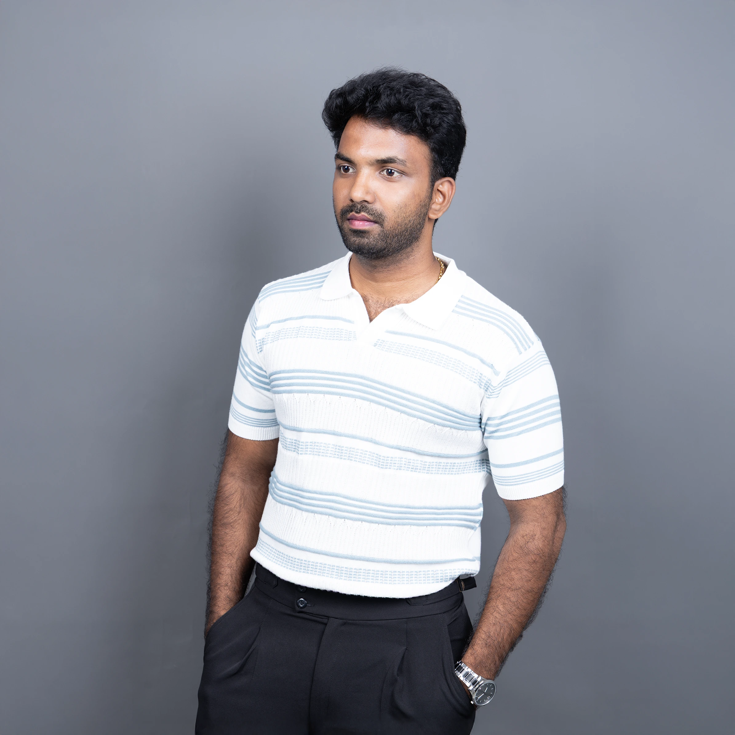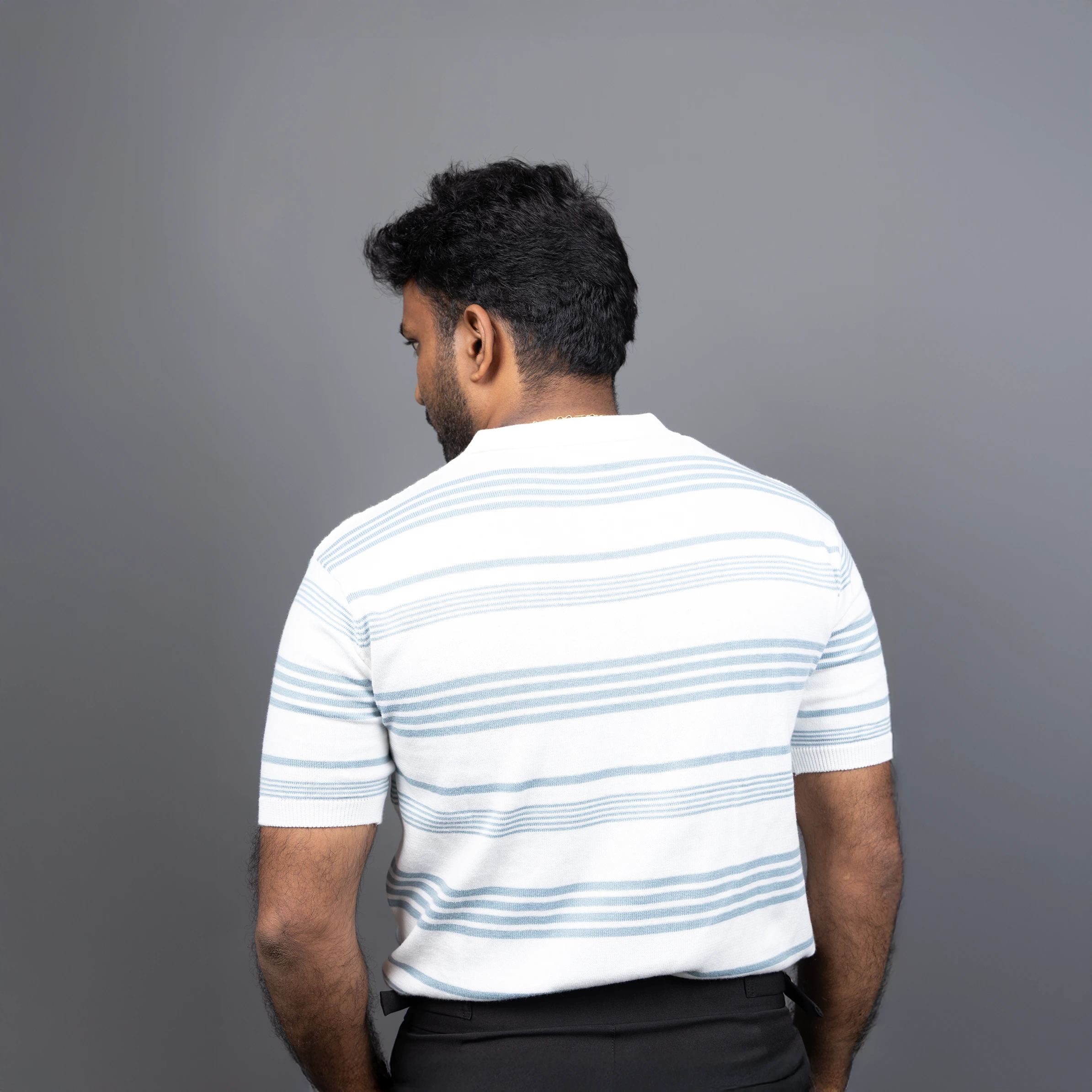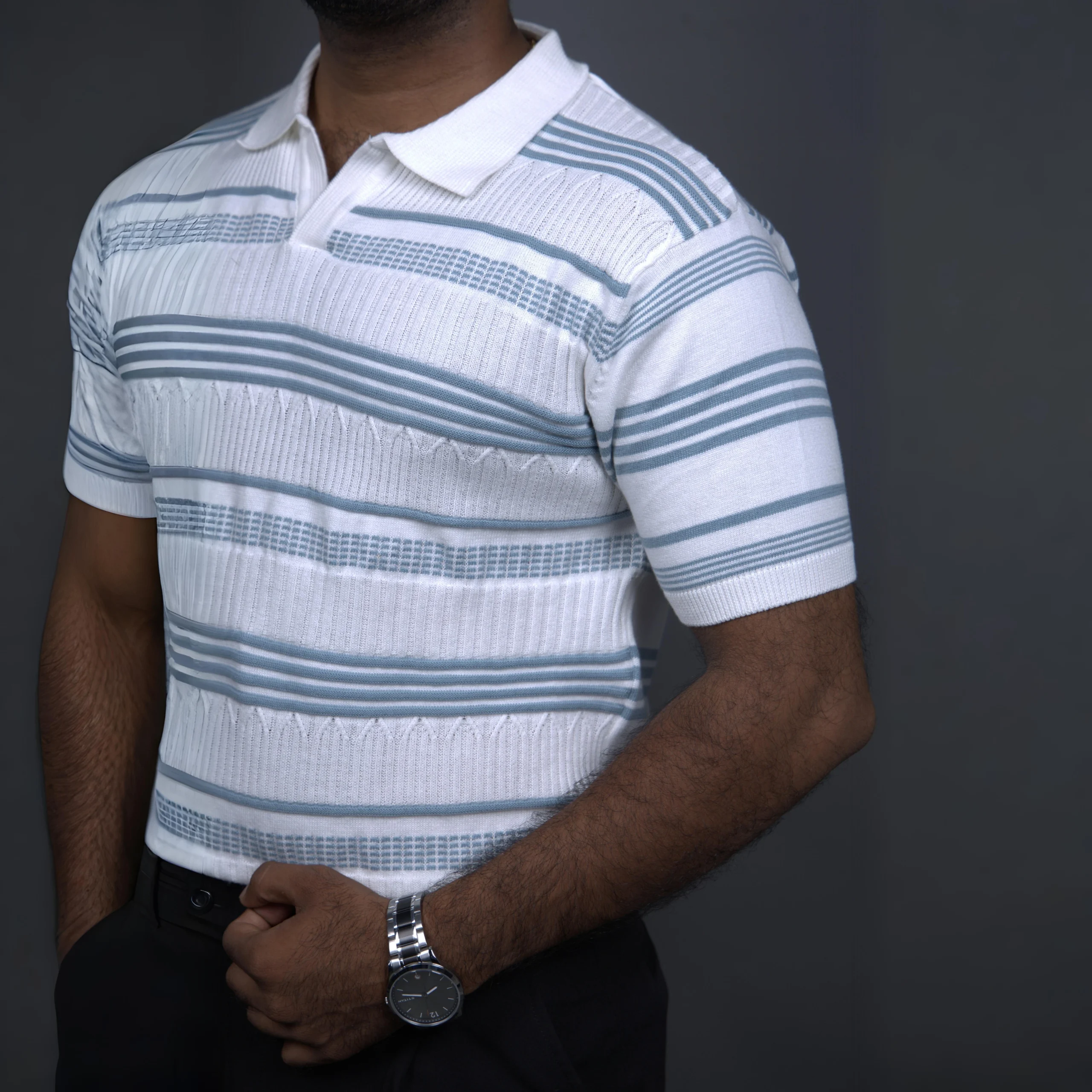 Embrace understated elegance with our Men’s Classic Ribbed Stripe Knit Polo. This versatile polo shirt features a refined horizontal ribbed texture in a sophisticated white and blue stripe pattern. Made from a comfortable and breathable knit fabric, it offers a soft feel against the skin and an excellent fit. The traditional polo collar and short sleeves make it a perfect choice for everyday wear, light casual events, or even a relaxed day at the office. A wardrobe essential for effortless style.